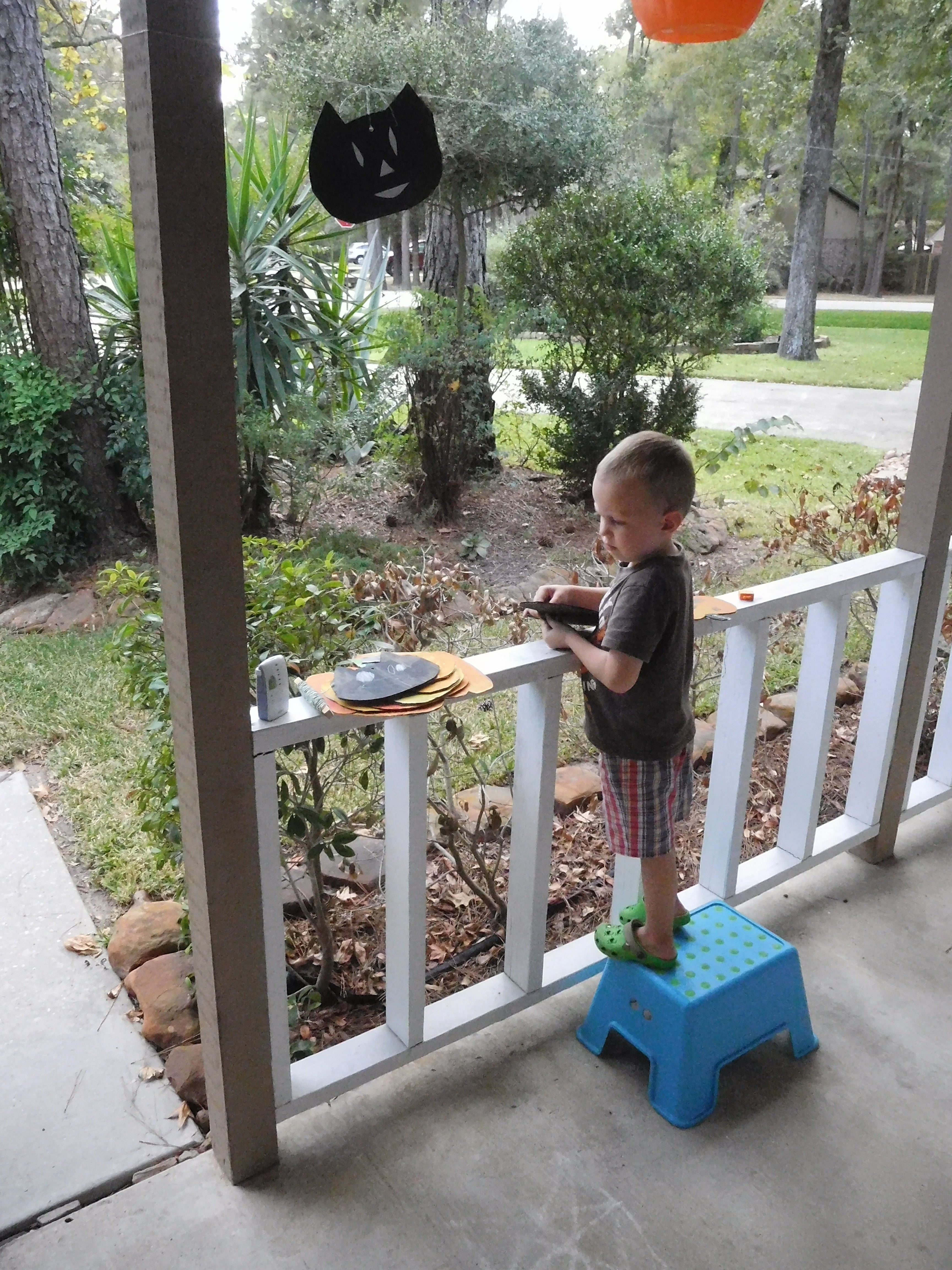 A pár slíbených fotek naší halloweenské výzdoby. Vloudila se mi tam jedna čínská plastová dýně. To je ale nutná výbava koledníků – nádoba na sladkosti.